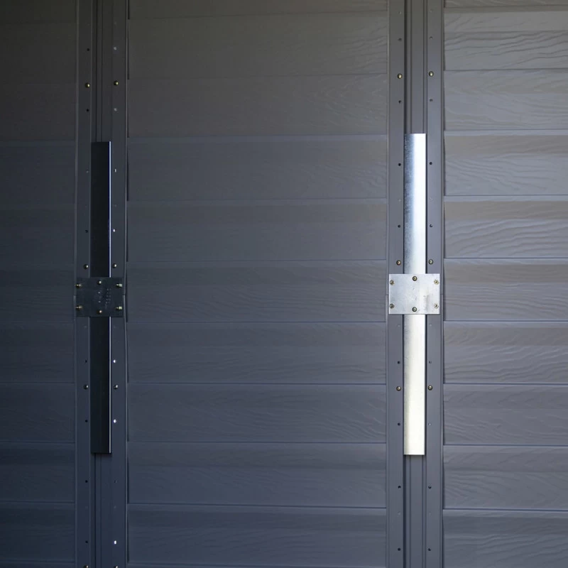 La structure est renforcée au moyen de raccords métalliques reliant les panneaux entre eux. Les tôles gris anthracite des parois ont une texture imitant le bois et sont conçues pour résister durablement aux intempéries ainsi qu’à la corrosion, avec une garantie de 12 ans. La toiture peut supporter une charge de neige allant jusqu’à 100kg/m².