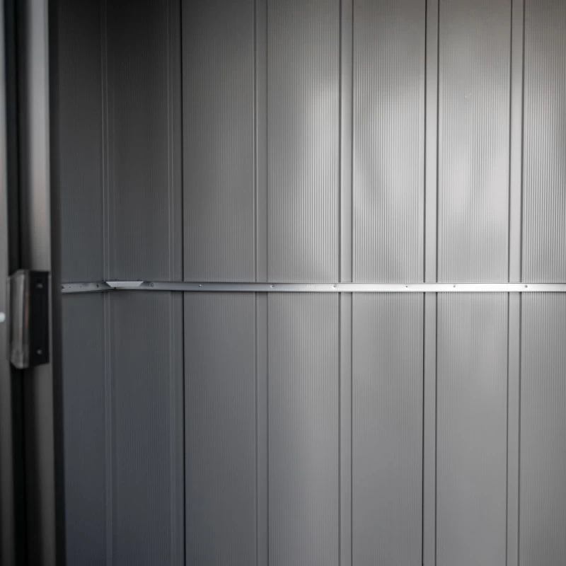 Cet abri est doté d’une toiture monopente, pour une évacuation optimale de l’eau de pluie ou de la neige accumulée, avec une résistance de 100kg/m² de charge de neige. La porte de l’abri a une largeur de passage de 82cm pour une hauteur de 165cm. De type coulissant, elle peut être verrouillée au moyen d’un cadenas non inclus. Cet abri bénéficie d’une garantie de 12 ans contre la corrosion.