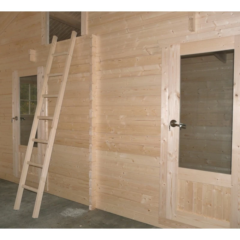 Au dessus de ces deux pièces, une mezzanine est accessible via une échelle en bois, sa hauteur maximale est de 185cm. Tous les vitrages des portes et fenêtres sont en verre de sécurité, pour votre sérénité, et les fenêtres ainsi que la porte principale sont décorées de croisillons en bois. L’installation de l’abri est à faire sur dalle de béton, que vous veillerez à isoler de l’humidité du sol par une membrane d’étanchéité. Le montage est simplifié par le système Place&Plug développé par le spécialiste belge des constructions en bois Solid, expert depuis 1992. C’est un système d’encoches situées aux extrémités des madriers qui apporte, en plus de l’aspect esthétique, une solidité structurelle à la construction et facilite à une mise en œuvre d’équerre. Par ces encoches, les parois s’imbriquent les unes dans les autres à la manière d’une cabane canadienne.