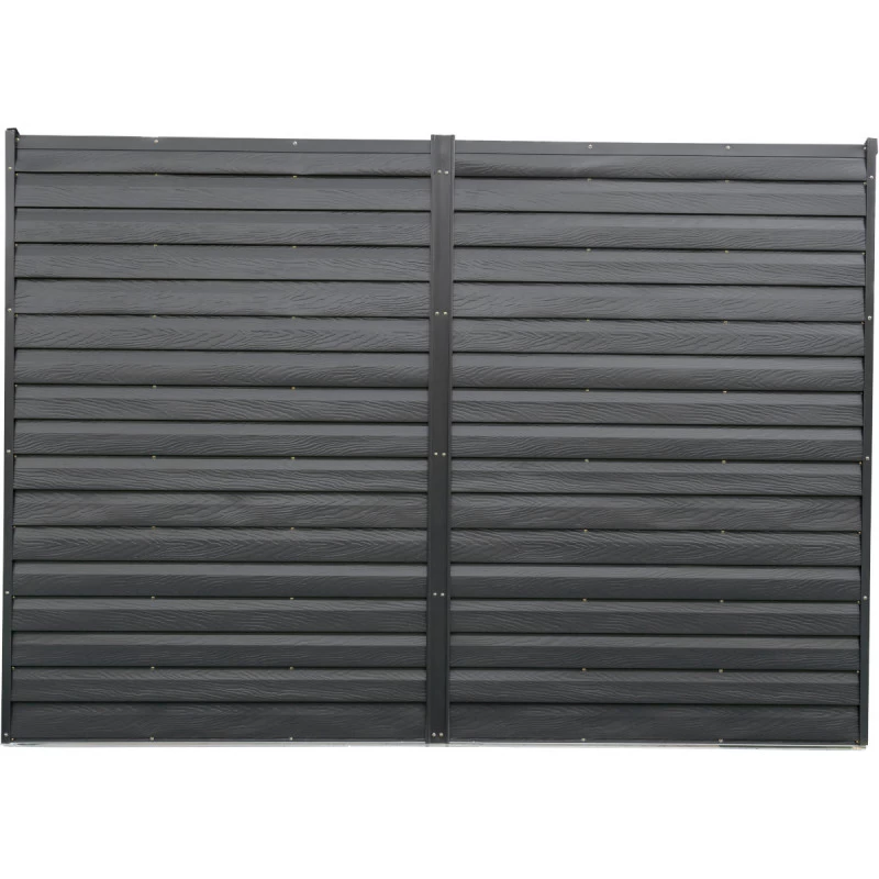 Cet abri de rangement adossé Spacemaker de 3,5m² est réalisé en tôles d’acier galvanisé de 0,3mm d’épaisseur. Il est doté d’une double porte battante sur toute sa profondeur de 124cm. La double porte peut être à moitié ouverte ou complètement. Un loquet verrouillable préservera vos biens en toute sécurité (cadenas non inclus). Les parties latérales de l’abri sont lisses et laquées en gris anthracite tandis que les parois longitudinales de 295cm de longueur offrent un contraste élégant en gris clair, avec un bardage apparent et une texture imitant le bois.