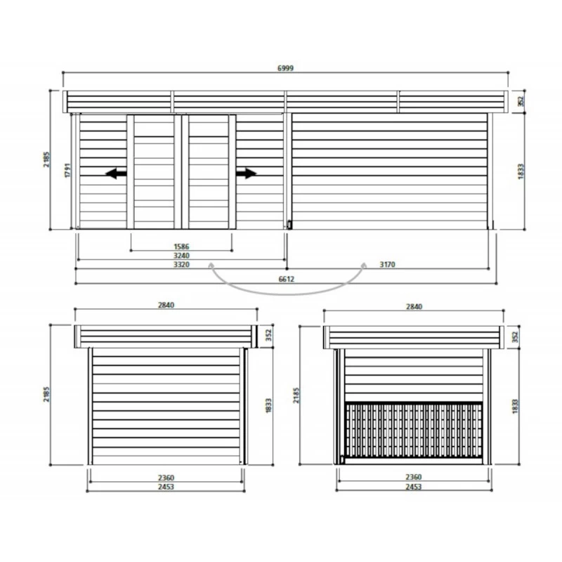 L’abri de jardin Arhus possède un look contemporain et moderne avec sa terrasse couverte, et il pourra être personnalisé pour répondre exactement à vos besoins et à votre inspiration. Le bois ayant déjà subi un traitement à cœur qui le protège des attaques d’insectes ou du pourrissement, vous pourrez profiter de votre abri dès son installation terminée. L’abri a une façade de 332cm comprenant une porte double coulissante exclusive avec 5 panneaux en verre trempé. D’une surface totale de près de 20m², la construction se compose d’un abri fermé de dimensions 332x245cm accolé à une surface couverte de dimensions 317x245cm.