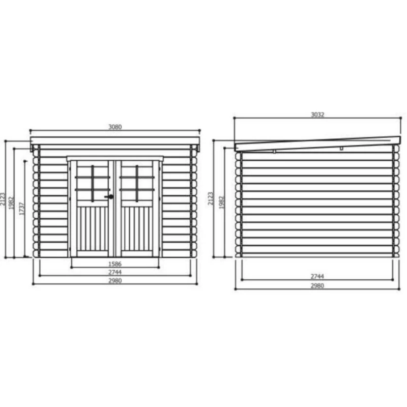 L’abri est livré sans traitement, vous pourrez donc appliquer la finition de votre choix, peinture opaque ou lasure en phase aqueuse, pour le décorer selon votre inspiration. L’abri a des dimensions de 298x298cm pour une surface extérieure de 8,88m². Sa hauteur maximale est de 212cm et la hauteur minimale de 198cm, avec une inclinaison de la toiture de 5°. Cette hauteur de plafond confortable permet des déplacements aisés dans l’abri, et permet un écoulement naturel de l’eau de pluie ou de la neige, avec une résistance à une charge de neige maximale de 75kg/m².