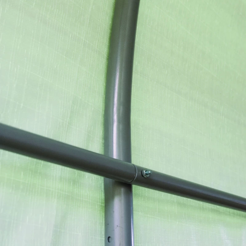 L’abri est livré en un colis, et possède une armature robuste de 35mm de section en acier thermolaqué Dupont Premium, qui ne craint pas la corrosion ni l’humidité. La couverture de l’abri est une bâche indéchirable en polyéthylène d’une densité élevée de 210g/m² résistant aux UV et imperméable, dont les éléments sont reliés par thermosoudure. L’abri possède des dimensions de 240x240cm et est muni d’une toiture à double pente dont la hauteur faîtière est de 240cm, offrant un large volume intérieur et facilitant l’écoulement de l’eau de pluie.