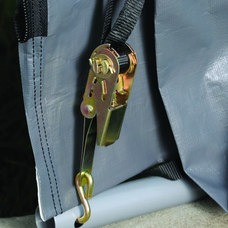 L’accès se fait par une large porte à glissières de 160x180cm qui peut être maintenue ouverte. La paroi arrière est renforcée, et la bâche est solidement fixée à l’armature au moyen de 8 sangles d’arrimage avec tendeurs à cliquet. L’ancrage au sol est assuré par 4 piquets de 38cm de long.