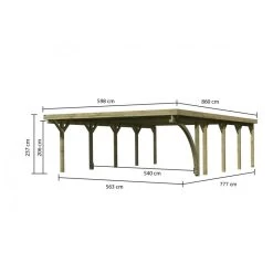 La construction de ce carport en bois repose sur les poteaux solides de 11,5cm qui doivent être renforcés par les supports d’ancrage à sceller, disponibles dans notre catalogue.