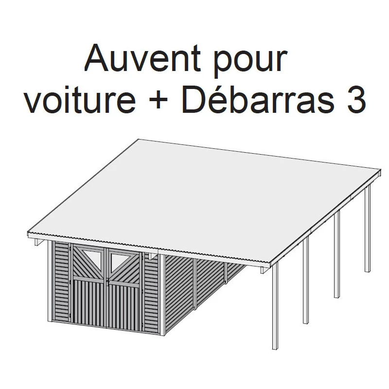 Voici un carport en bois à fonctions multiples : auvent pour un véhicule de type berline et grand entrepôt pour votre équipement de jardin. Le débarras peut être transformé également en atelier en fonction de vos besoins.