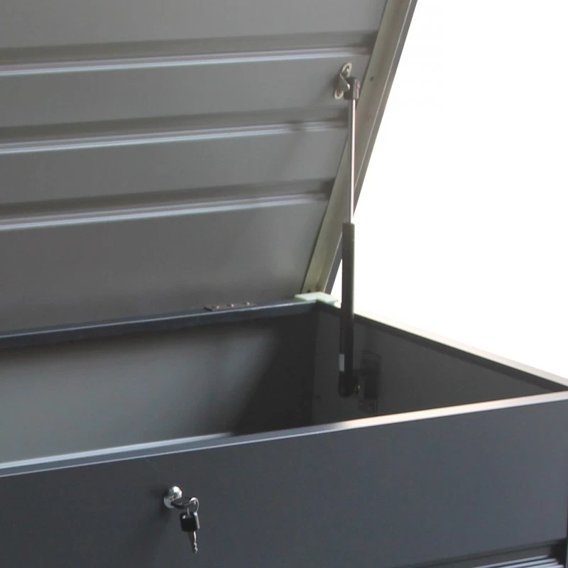 Il possède des parois en acier galvanisĂ© Ă chaud de 0,40mm, ce qui est bien supĂ©rieur aux autres coffres en mĂ©tal sur le marchĂ©. La capacitĂ© d’environ 570L en fait un des coffres les plus volumineux pour ce niveau de prix !