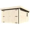 En façade, la large porte  à 2 battants mesure 2,40m de large pour une hauteur de 1,88m et les pentures sont bichromatées pour une meilleure longévité. La couverture du toit à double pente est en plaques ondulées colorées de la marque Onduline et est garantie 2 ans. La toiture repose sur des parois de 203cm et la hauteur faîtière est de 243cm, pour un confort d’utilisation optimal.
