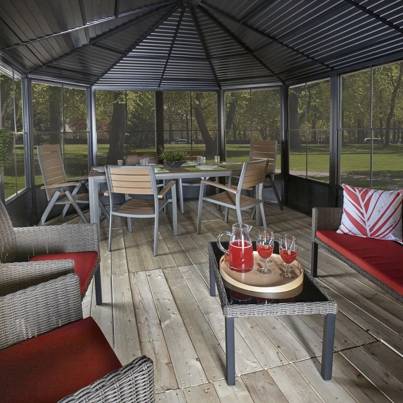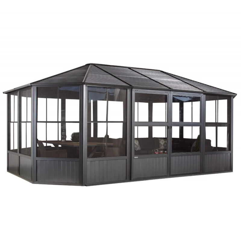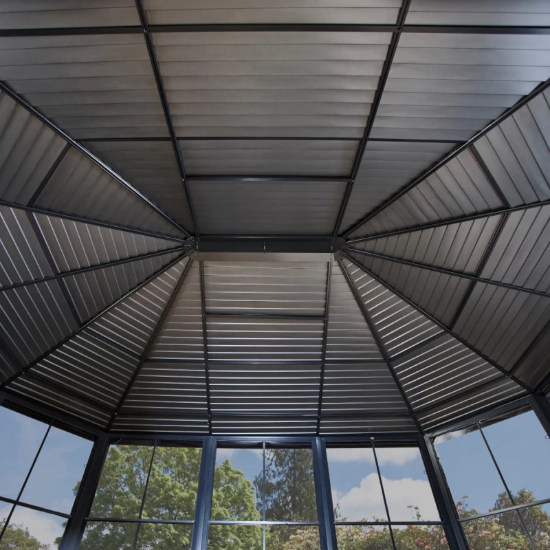 Le pavillon Charleston à 16 pans de Sojag s’inscrit dans un rectangle de 384x594cm de côtés. Il possède une structure robuste en aluminium gris thermolaqué qui ne craint pas la corrosion et qui peut soutenir une charge de neige exceptionnelle de 150kg/m². La hauteur faîtière de la structure est de 280cm, la largeur au sol est de 367x577cm. Le pavillon est composé de 16 panneaux, dont 15 fenêtres à guillotine et une porte double coulissante de 207cm de passage pour une hauteur de 201cm.