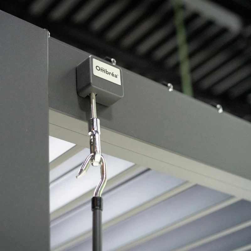 La toiture est divisĂ©e en 2 parties, chacune Ă©quipĂ©e d’une manivelle pour orienter les lames Ă votre convenance. Ainsi, un cĂ´tĂ© de la pergola pourra garder les lames fermĂ©es pour apporter de l’ombre Ă vos convives pendant que l’autre cĂ´tĂ© sera ouvert pour les amoureux du soleil !