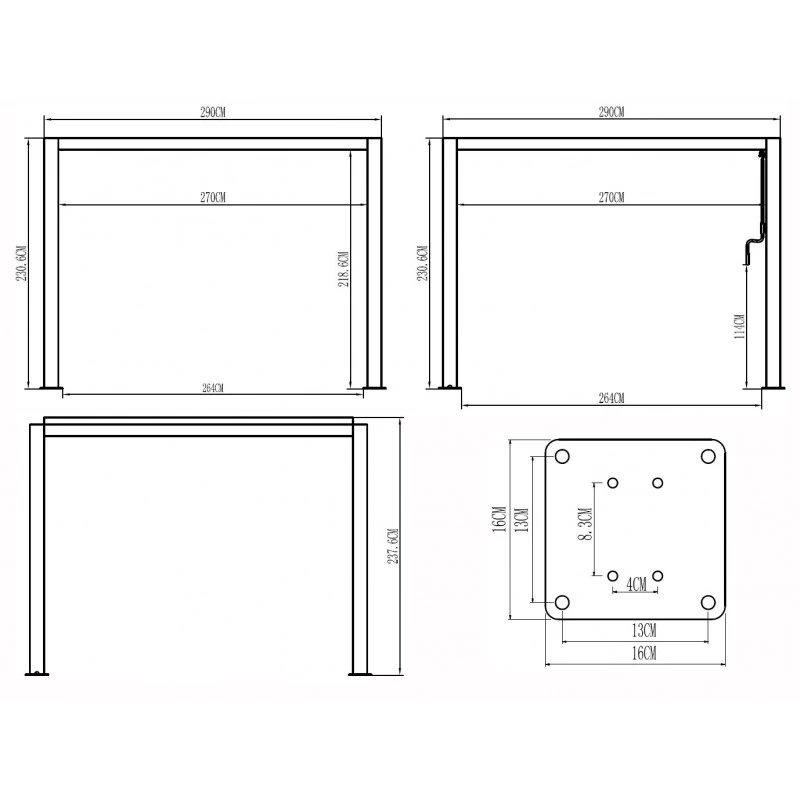 Système d’évacuation d’eau intĂ©grĂ© – l’eau s’écoule par l’intĂ©rieur de la structure, les profilĂ©s du haut de la pergola sont creux pour rĂ©cupĂ©rer l’eau de pluie. Ensuite, l’eau s’écoule dans les pieds qui sont creux Ă©galement. Il y a des trous d’évacuation en bas des pieds pour que l’eau s’évacue Ă l’extĂ©rieur.