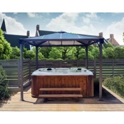 Et très fonctionnelle, notamment par sa simplicité d’installation, par les gouttières munies d’embouts pour raccorder des descentes d’eau ou par sa faîtière conçue pour réguler au mieux les flux d’air, très utile pour évacuer fumées ou condensation. Cette tonnelle est idéale pour y installer un jacuzzi ou un barbecue, pour passer de bons moments en famille ou simplement pour savourer un moment de calme en extérieur.