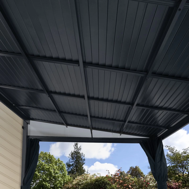 Avec une profondeur de 298cm pour une longueur de 484cm, la tonnelle adossée Portland vous offre un espace supplémentaire, une transition agréable entre l’intérieur et l’extérieur. Cette tonnelle d’une hauteur maximale de 240cm vous protégera des chaleurs excessives ou vous permettra de profiter de votre terrasse lorsque le ciel est maussade ou pluvieux. Ce modèle qui vous est proposé par le spécialiste canadien Sojag dispose d’une structure robuste en aluminium thermolaqué, garanti 5 ans contre la corrosion, avec des poteaux de soutien de 76mm de section.