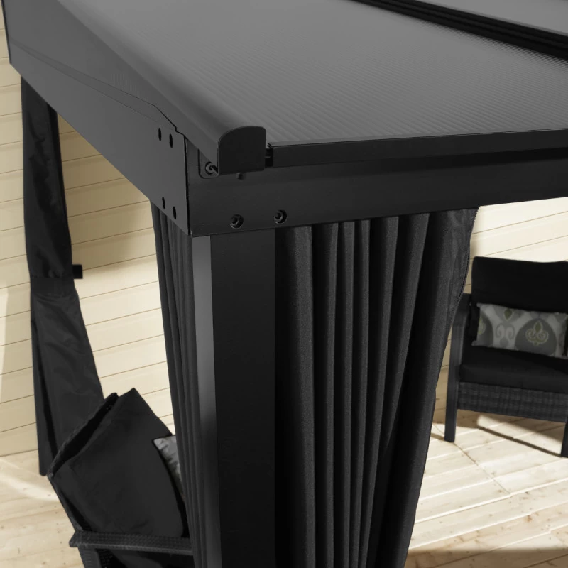 La tonnelle adossée St. Barth est livrée avec un ensemble de moustiquaires et un complet de rideaux en polyester épais d’une densité de 180g/m². Vous pourrez profiter sereinement de vos soirées sans vous préoccuper des insectes nuisibles ou du regard de vos voisins, puisque moustiquaires et rideaux peuvent être installés simultanément grâce au système de double rail.  Avec la visserie en acier inoxydable fournie, la tonnelle ne craint pas les conditions hivernales et ne devra pas être remisée. Les poteaux sont pré-percés en usine pour l’ancrage (non inclus) qui dépendra du support de votre terrasse.