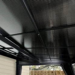 La toiture est constituée de panneaux en polycarbonate à double paroi de 8mm d’épaisseur teintés, et celle-ci peut soutenir une charge de neige de 125kg/m². Il est cependant conseillé d’évacuer la neige pour éviter une accumulation excessive. Les panneaux sont traités contre le rayonnement UV, et la toiture est inclinée pour une évacuation optimale de l’eau de pluie.