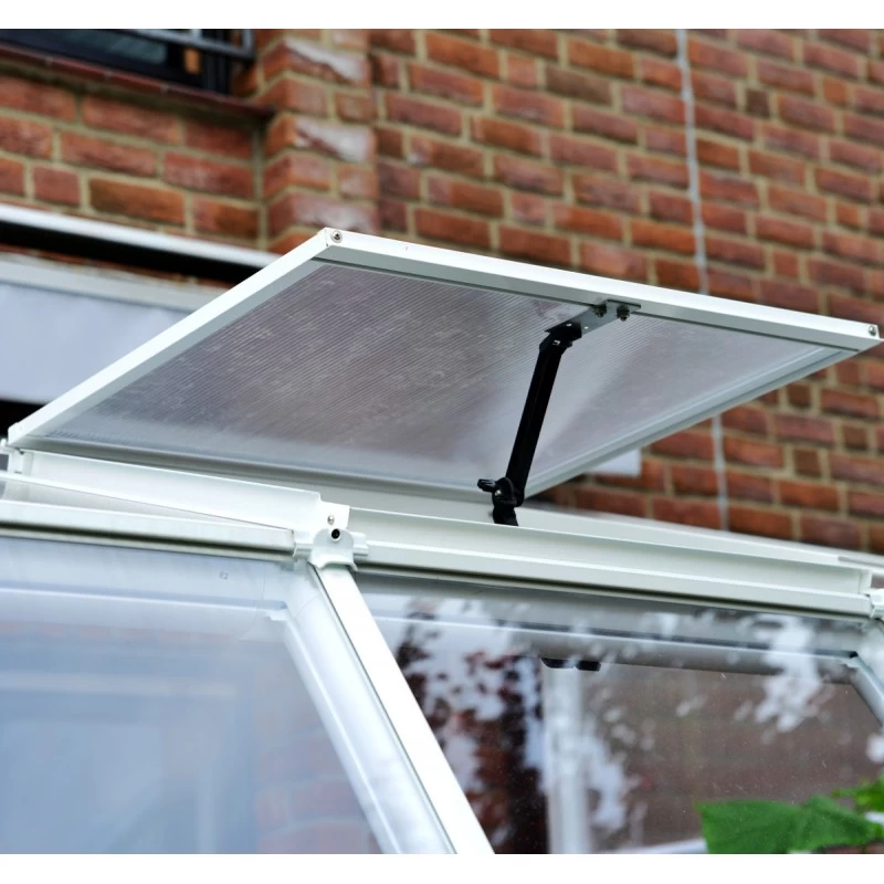 La porte verrouillable se combine avec la lucarne de ventilation pour une gestion optimale de l’aération et de l’hygrométrie ambiante. L’utilisation d’un cadre en résine de PVC très robuste et les panneaux de toit en polycarbonate de 4mm d’épaisseur à doubles parois fournissent une isolation très efficace, tout en maintenant une bonne rigidité structurelle.